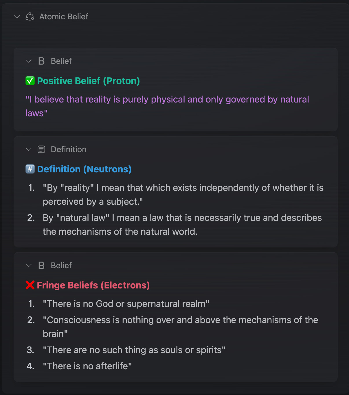 Atomic beliefs are the fundamental building blocks of your micro-philosophy, but even atoms have parts.